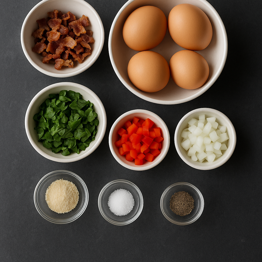 - Stir in the chopped spinach, diced bell pepper, diced onion, and crumbled bacon. Mix well to evenly distribute the ingredients throughout the egg mixture.
